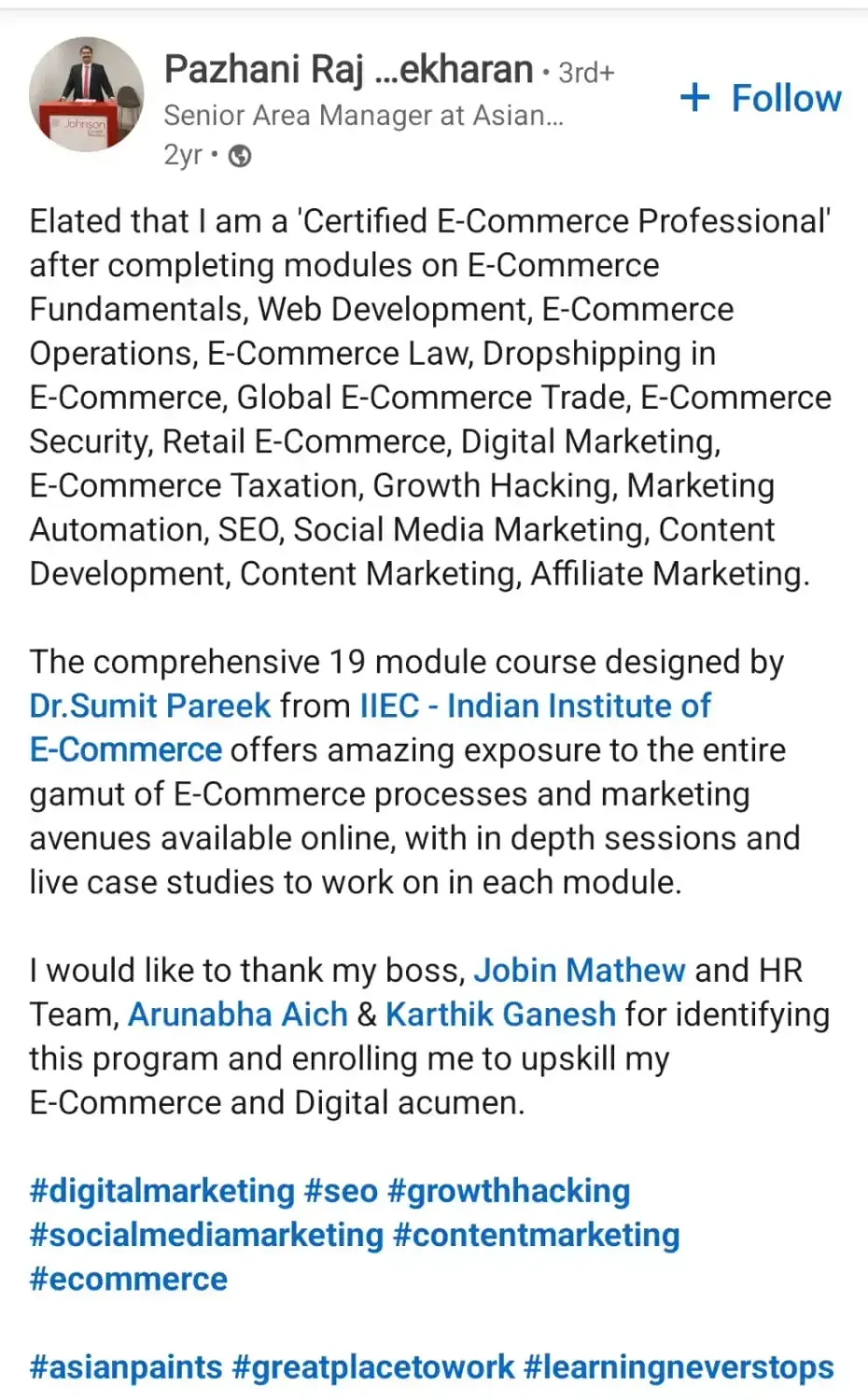 He is the creator of the Certified E-commerce Professional program, recognized worldwide for its impact. Dr. Pareek has also incubated numerous e-commerce startups, fostering innovation and industry growth. He has empowered students with vital e-commerce skills by collaborating with institutions like TISS.